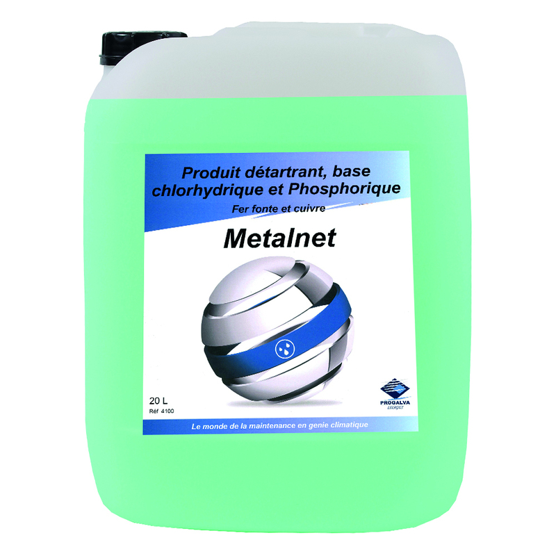 Produit détartrant à action rapide composé d’acide chlorhydrique, acide phosphorique, inhibiteurs de corrosion, tensio-actifs et anti-mousse. METALNET est un produit très performant pour détartrer et désoxyder. Il respecte les métaux tels le fer, la fonte, le cuivre, sauf l’inox, l’aluminium et le zinc, pendant la durée de l’opération de détartrage.
